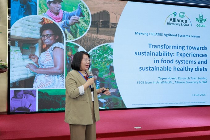 Từ góc nhìn khu vực, bà Huỳnh Thị Thanh Tuyền, Trưởng nhóm Môi trường thực phẩm và Hành vi người tiêu dùng khu vực châu Á (Alliance of Bioversity International & CIAT), trình bày về chuyển đổi hệ thống thực phẩm và chế độ ăn lành mạnh. Bà cho rằng, chỉ khi chính sách và hành động cộng đồng cùng hướng tới giá trị dinh dưỡng, sức khỏe và môi trường, chúng ta mới có thể đảm bảo mọi người dân đều tiếp cận được thực phẩm an toàn và bền vững – điều đang trở nên cấp thiết trong bối cảnh biến đổi khí hậu.