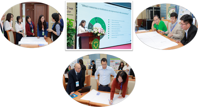 Phiên thảo luận nhóm “Vòng tròn hợp tác – Hành động đồng sáng tạo Mekong” đầy tinh thần kết nối và sôi nổi. Các đại biểu được chia thành ba nhóm chủ đề: