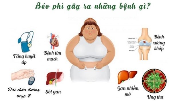 Thừa cân-béo phì là yếu tố nguy cơ của nhiều bệnh tật như: tăng huyết áp, xơ vữa mạch máu, nhồi máu cơ tim, tai biến mạch não, hẹp tắc động mạch chi, bệnh đái tháo đường, rối loạn chuyển hóa mỡ máu, tăng acid uric gây bệnh gút, bệnh lý đường hô hấp, gan nhiễm mỡ, giảm khả năng sinh sản… Theo Cơ quan Nghiên cứu Ung thư Quốc tế (IARC) thuộc Tổ chức Y tế Thế giới (WHO) béo phì liên quan đến 14 loại ung thư khác nhau (WHO, 2021).